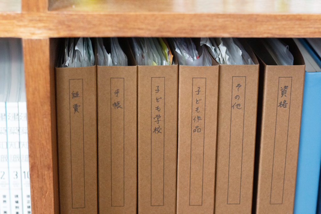 3、カテゴリを書く:「学校」「習い事」「契約書」など、背表紙にカテゴリを記入して収納します。